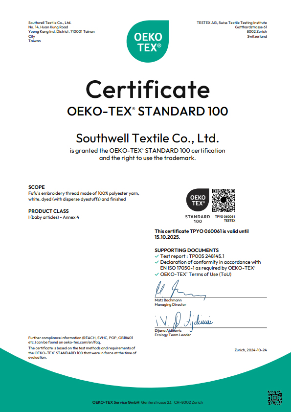 To ensure that our products meet international textile environmental certifications and stringent requirements on environmental protection and dyestuffs worldwide, our rayon and polyester embroidery threads are certified to Oeko-Tex Standard 100, Product Class 1 (Baby standard). The certification shows that our threads meet the human-ecological requirements of the standard and no environmentally harmful products and carcinogens are utilized in the production of our products.