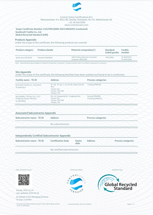In order to enhance the sustainability of products and increase the use of recycled materials, our plant has achieved GRS (Global Recycled Standard) certification to ensure that the production management system, environmental management and chemical control are in compliance with certification standards to reduce potential harm and impact on the environment